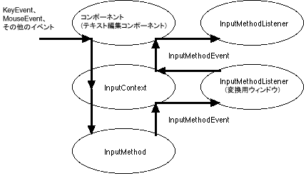 KeyEvent や MouseEvent などの入力イベントは、InputContext オブジェクトを通して現在のインプットメソッドに送られます。インプットメソッドでは、テキスト変換のイベントを使った場合、イベントが使われたことを指定し、インプットメソッドイベントを生成します。このイベントは、変換用ウィンドウにリダイレクトされ、処理されます。テキストが確定されると、変換用ウィンドウでは、そのテキストが、クライアントの実際のキーイベントリスナーに対するキーイベントに変換されます。KEY_TYPED イベントだけが送信されます。