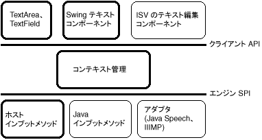 インプットメソッドクライアント API で定義されているクラスとインタフェースを使うと、テキスト編集コンポーネントで統合テキスト入力ユーザインタフェースを実装できます。AWT テキストコンポーネント TextArea と TextField は、実装方法によって、オンザスポット編集またはオーバーザスポット編集の機能を提供します。Swing ユーザインタフェースツールキットのテキストコンポーネントは、統合テキスト入力ユーザインタフェースを提供します。コンテキスト管理は、テキスト編集コンポーネントとインプットメソッドの間の通信経路を管理します。インプットメソッドエンジン SPI には、インプットメソッドエンジンおよびインプットメソッドアダプタをフレームワークにプラグインするためのインタフェースを定義します。インプットメソッドエンジンは、これらのインタフェースを使って Java プログラミング言語内に直接実装できます。ホストのインプットメソッドマネージャに統合されているネイティブインプットメソッドを使えるように、アダプタは、ネイティブインプットメソッドおよびインプットメソッドフレームワークで使用されるデータモデル間で情報を変換し、変換用ウィンドウを表示します。また、Java Speech または Internet-Intranet Input Method Protocol (IIIMP) など、その他の入力システム用のアダプタも、このインタフェースを使って実装できます。